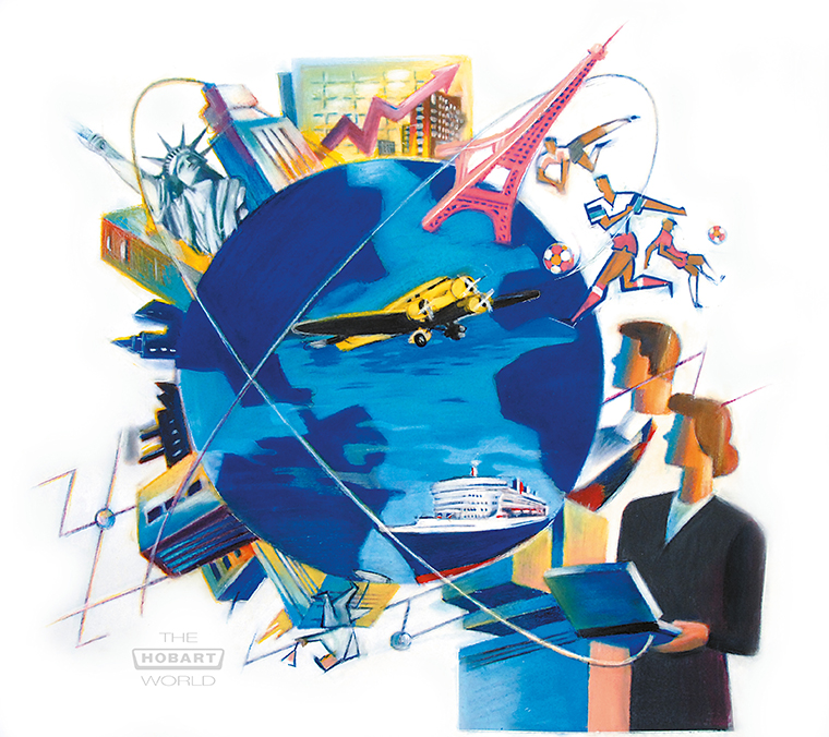 That’s why I had the idea of a painting reflecting HOBART’S worldwide activities. Because you will find HOBART machines in hotels as well as at airports and on ships, in football stadiums, bars and industrial companies from New York to Paris but also in Dubai, where saving water is essential and more important than oil.