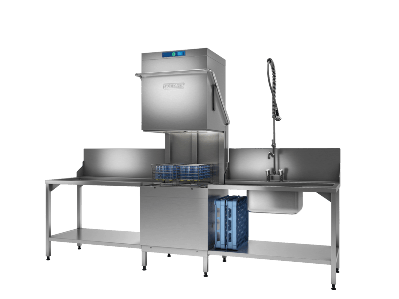 The fresh water is heated with the energy from the waste steam, thus reducing the energy required for reaching the rinse temperature by up to 7.8 kWh. - Automatic hoodlift
