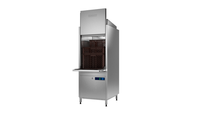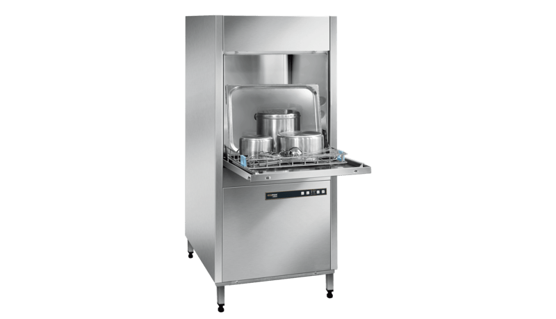 Integreret i blødsætnings- og dampprogram, sidemonteret vaske-, skyllearme og skinner der passer til 1/1 og 1/2 GN kantiner.