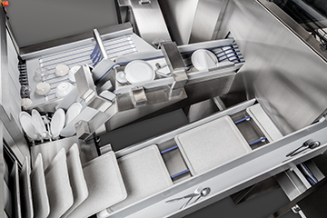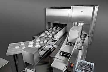 Systemet består af en automatisk sorteringsenhed, en FTNi fingerbåndsmaskine til bakker og bestik, samt en ekstra bred FTNI til skåle og tallerkner.
