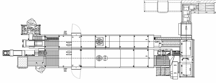 Lay-out over automatisk opvaskesystem med automatisk sortering.